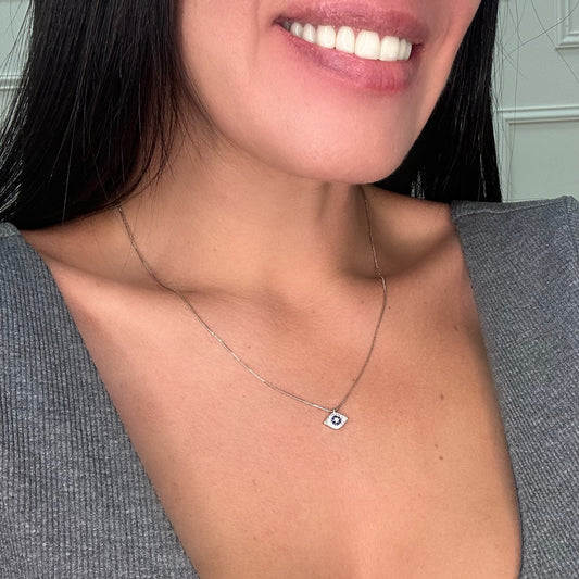 SMALL BLUE EVIL EYE NECKLACE | White Rhodium Plated