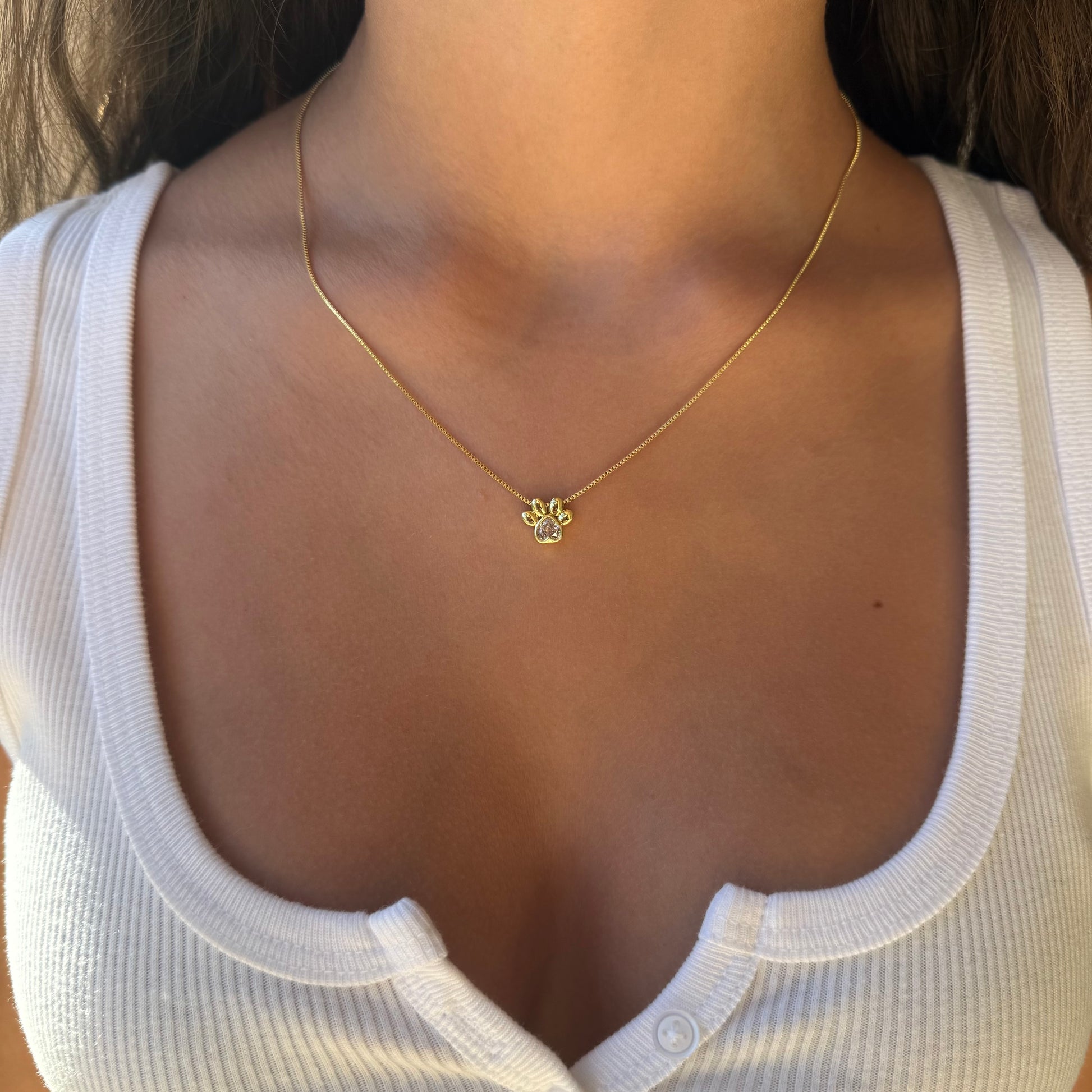 The AMIE Necklace in warm 18K gold-plated finish celebrates unconditional love through its delicate paw pendant with a sparkling heart center. Named after the French word for 'friend,' this piece honors the special bonds that words can't quite capture.