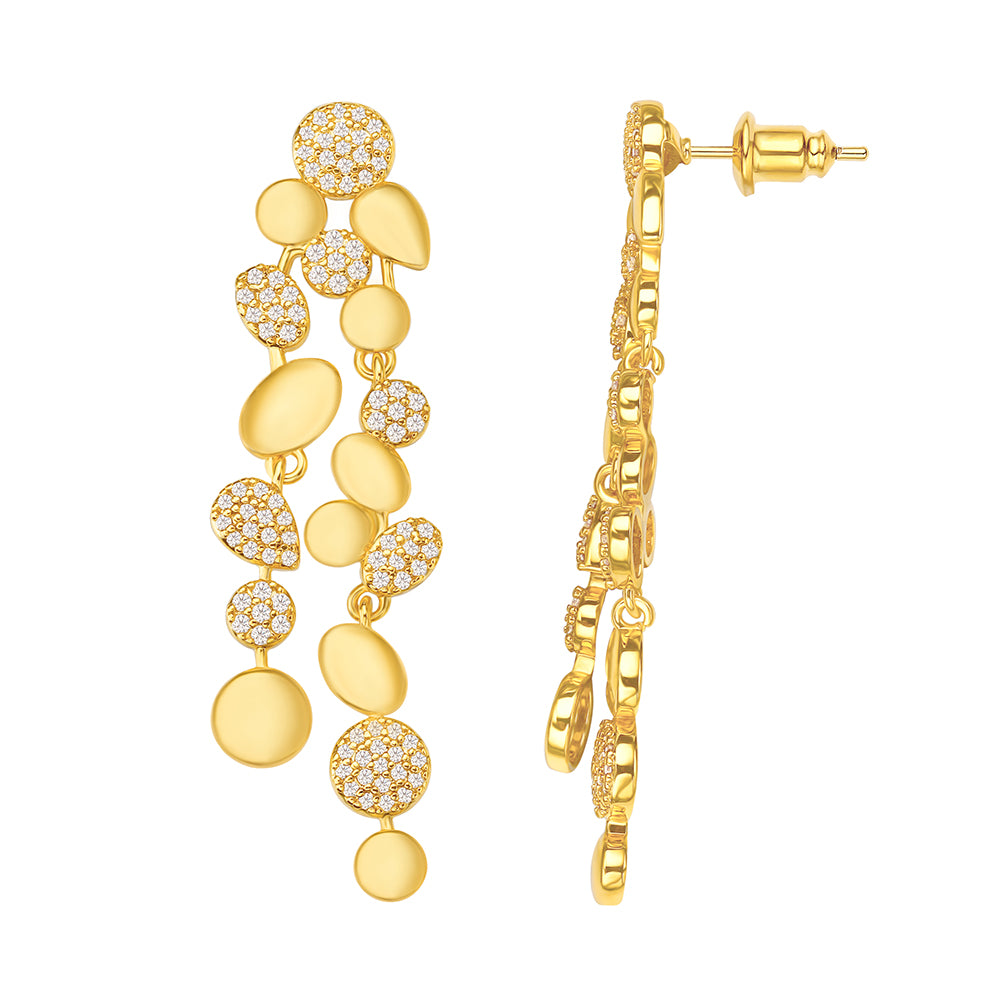 The AURIA Cascade Earrings in warm 18K gold-plated finish feature alternating pavé brilliance and smooth organic discs that catch light from every angle, creating movement that's impossible to ignore. These golden earrings don't just accessorize your outfit—they animate it with luxurious warmth.