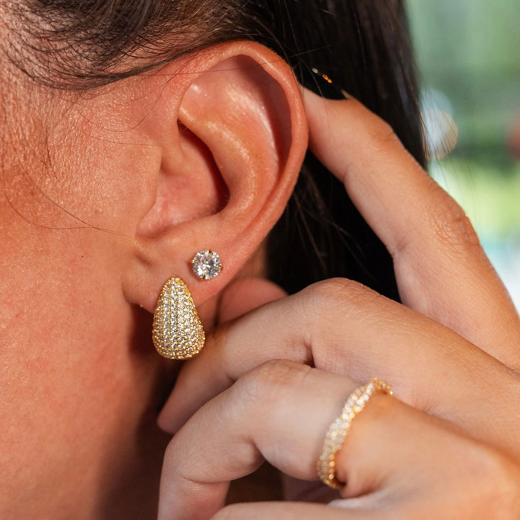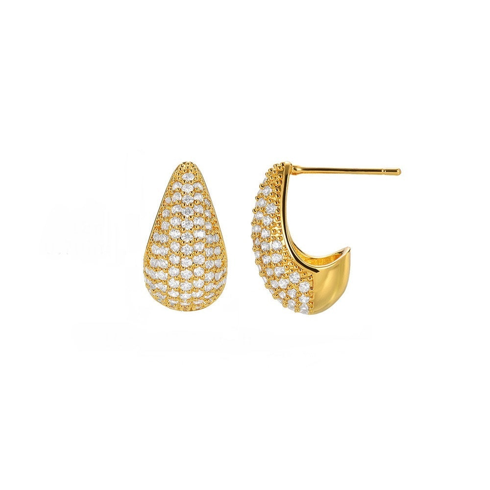 The LUNARA Earrings in luxurious 18K gold-plated finish are designed for the woman who isn't afraid to shine. With their bold, curved silhouette fully adorned with sparkling zirconia, these golden earrings create an aura of sophisticated glamour that transforms any occasion.
