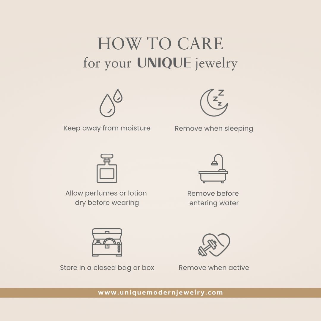 - Avoid contact with: seawater, swimming pool, perfume, cosmetics, detergent, hand sanitizer, chemicals, moisture, excessive sweat, workout wearing the jewelry or any abrasive products.