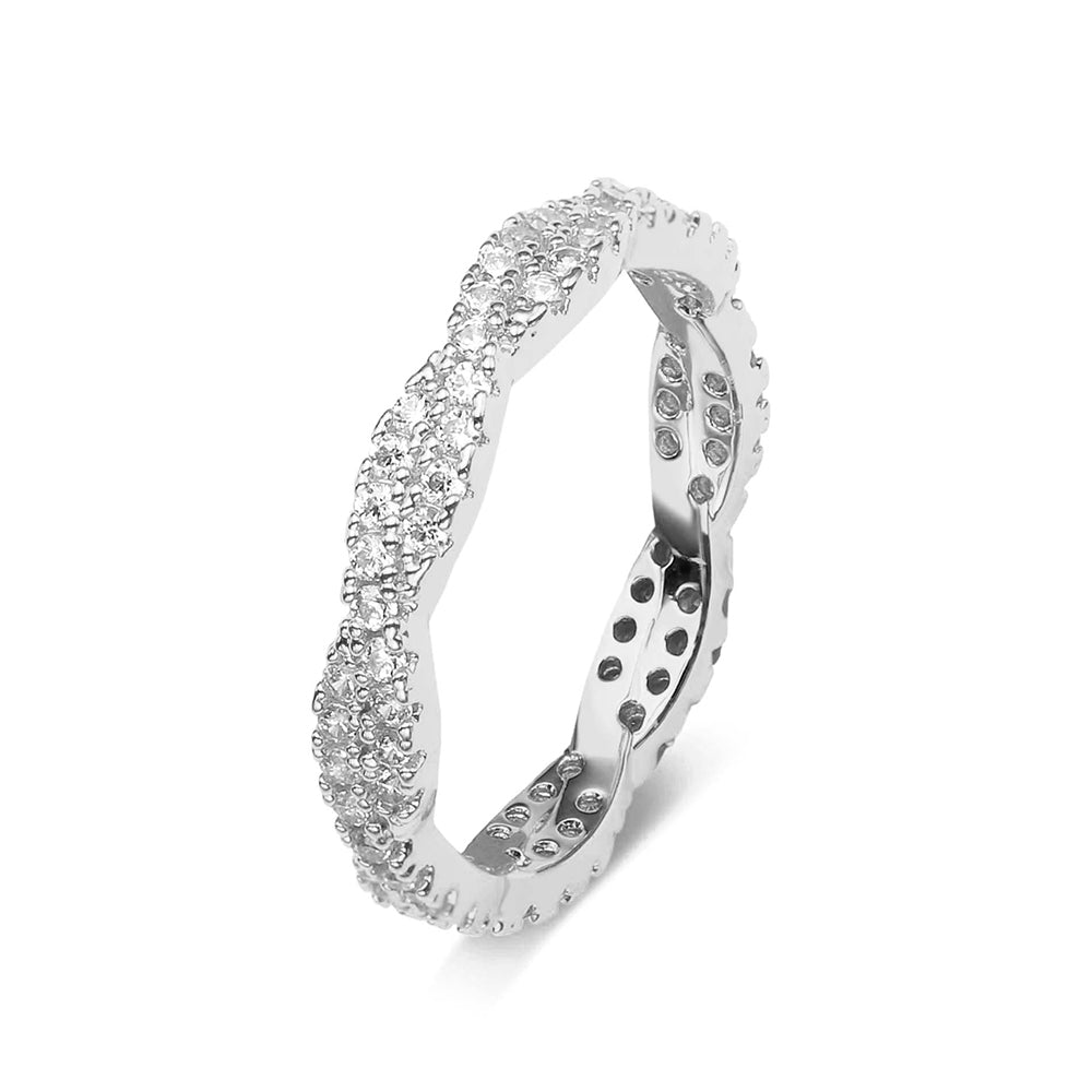 The SERENA Ring in sophisticated white rhodium-plated finish features a graceful twisted band that symbolizes the beautiful interweaving of life's most precious moments. Adorned with brilliant pavé-set stones, this silver ring offers refined sparkle that catches light from every angle.