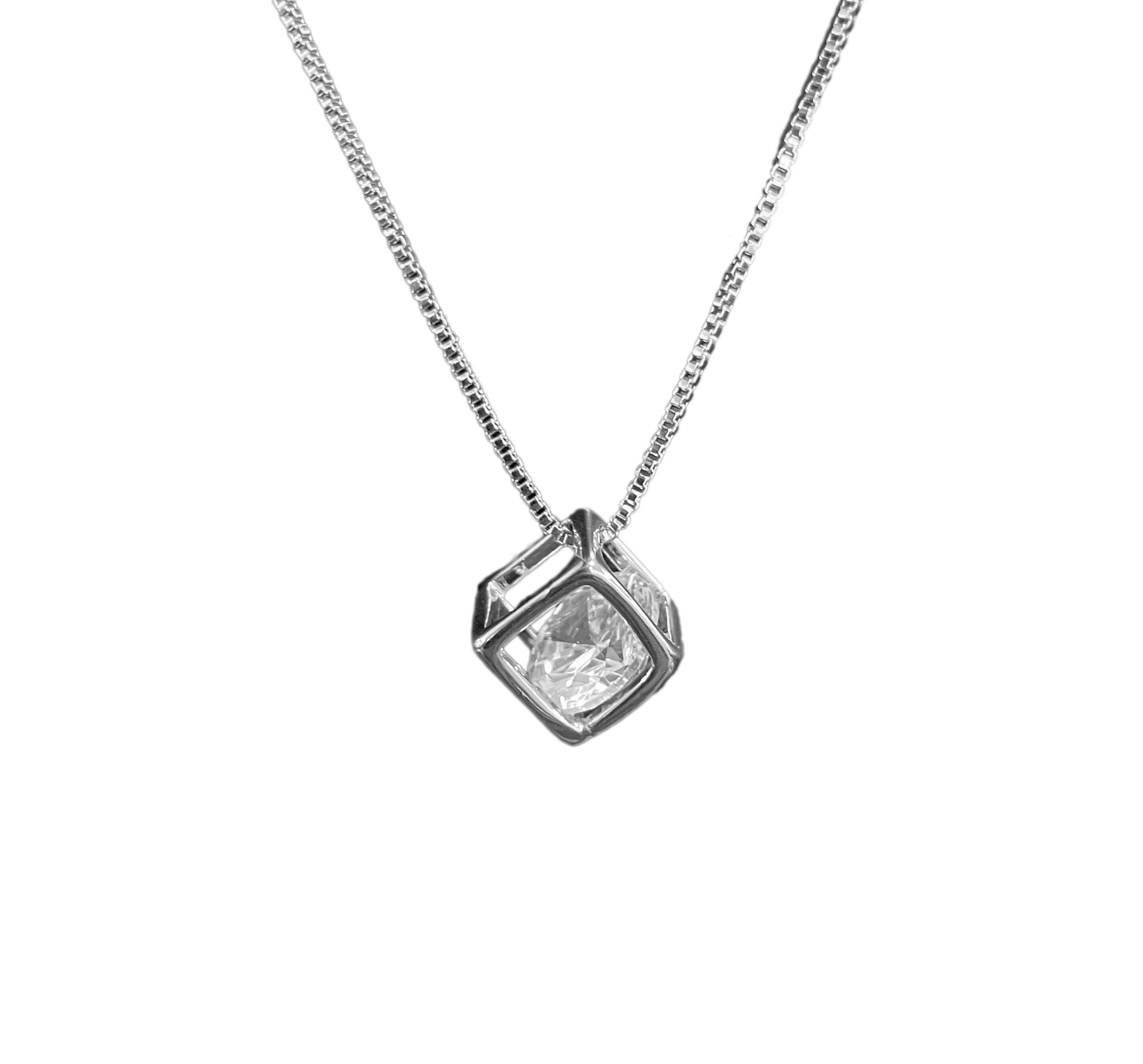 Introducing the SQUARE STUD NECKLACE | White Rhodium Plated. Elevate your style with this minimalist and elegant necklace featuring a unique square pendant with movable zirconia stone in it that catch light from every angle. A must-have accessory for those who appreciate sophistication and exclusivity.
