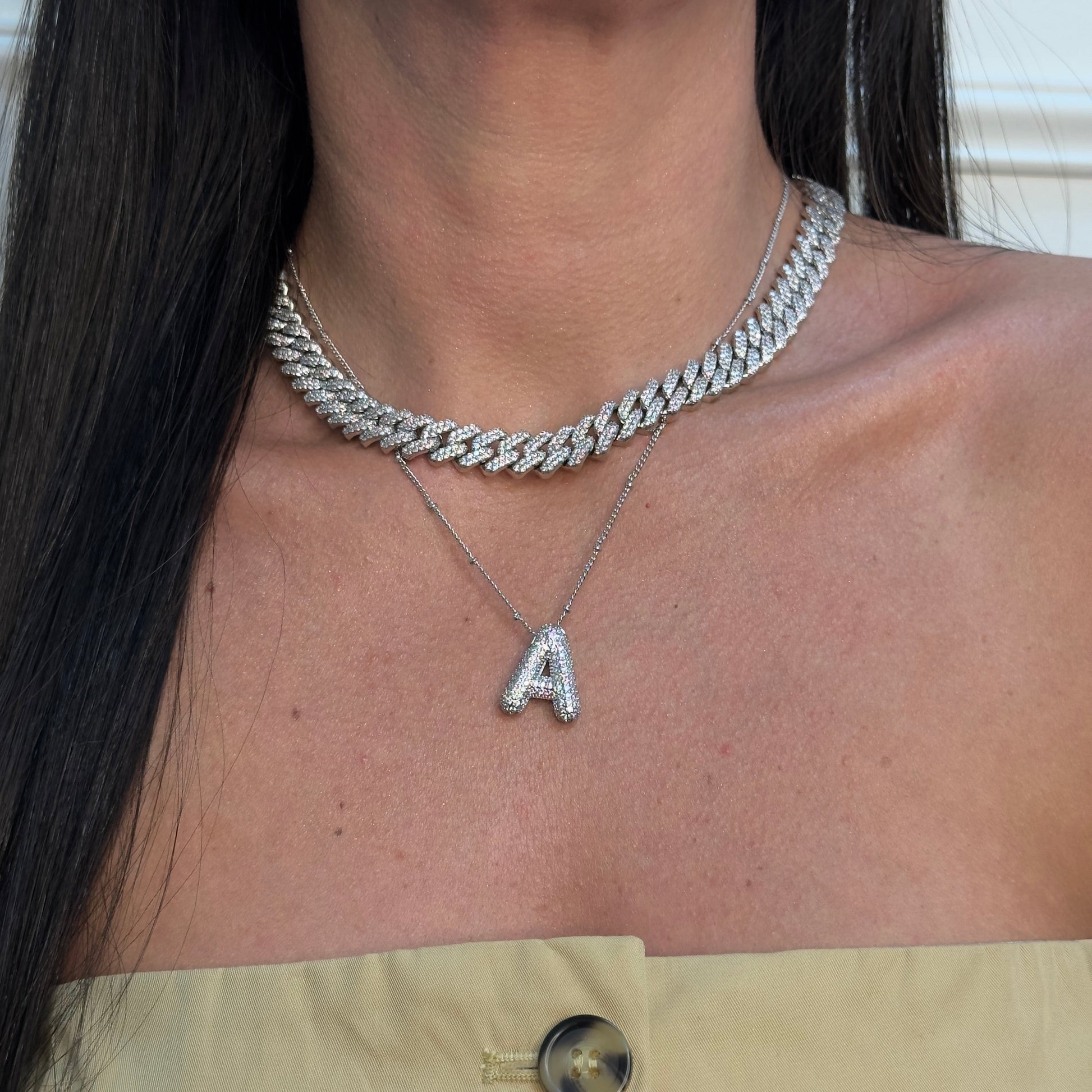 White rhodium-plated balloon-style initial pendant, fully studded with premium crystal zirconia stones